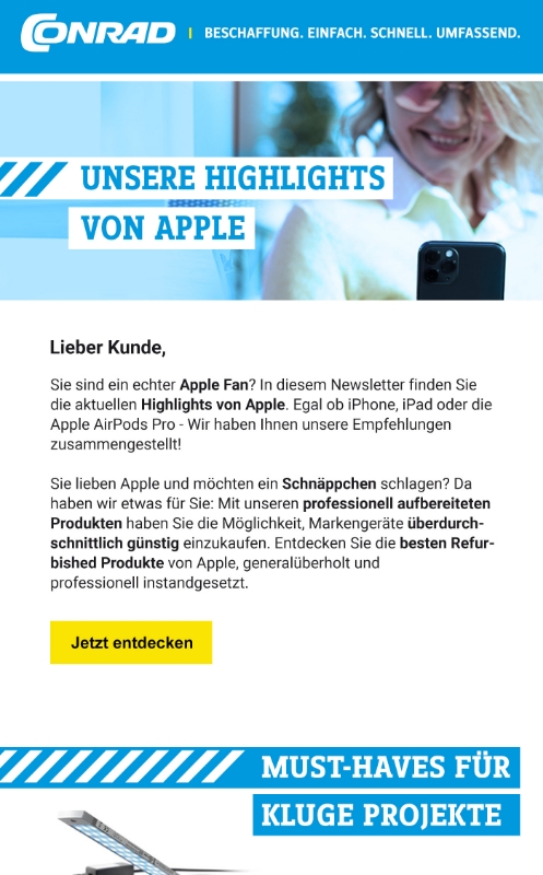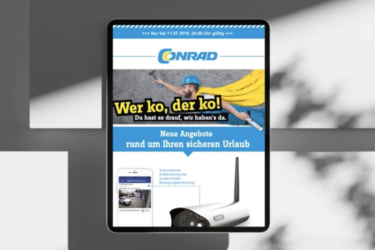 Im Rahmen des Markenauftritts von Conrad haben wir das Team bei der Erstellung und Gestaltung von Newslettern und digitalen Anzeigen unterstützt. Ziel war es, die visuelle Linie der Marke konsequent in den digitalen Kommunikationskanälen fortzuführen – klar, aufmerksamkeitsstark und zielgruppengerecht.