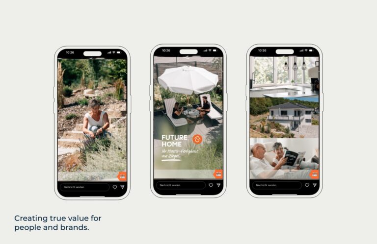 Auch das Wording wurde gezielt emotionalisiert. Eine moderne, ehrliche und nahbare Sprache spricht Bauinteressierte direkt an. Persönliche Tonalität, echte Geschichten und ein eigens entwickelter Markencharakter – der „homey“ – schaffen zusätzlich Sympathie und Verständlichkeit im Informationsfluss.