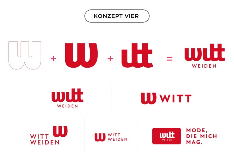 Mode, die mich mag – ein jahrzehntelanges Leben höchster Qualitätsansprüche und Servicegedankens – ein Leben für die Kundin. Der ikonische Bauhaus-Schriftzug WITT und das mehrfach modifizierte „W“ der Typografie stehen seit je her für die Witt Werte. Jeder unserer Vorschläge greift die Form des ikonischen „W“ im Kern auf und verknüpft diese mit modernen Markenansätzen.